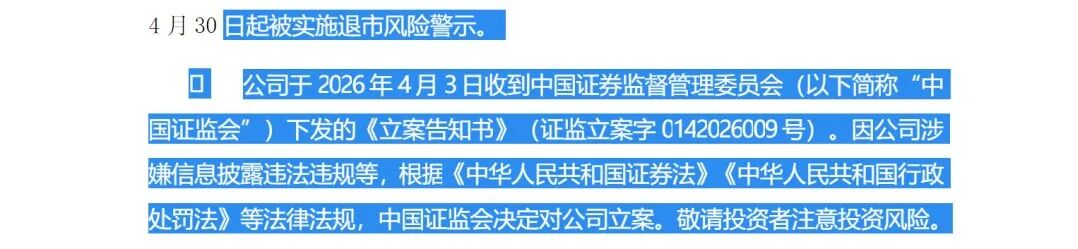 除财务问题外,*ST观典还有违法违规案件“缠身”。在公司股票可能被终止上市的风险提示公告中,*ST观典披露,公司于2026年4月3日收到中国证监会下发的《立案告知书》。因公司涉嫌信息披露违法违规等,根据《中华人民共和国证券法》《中华人民共和国行政处罚法》等法律法规,中国证监会决定对公司立案。
