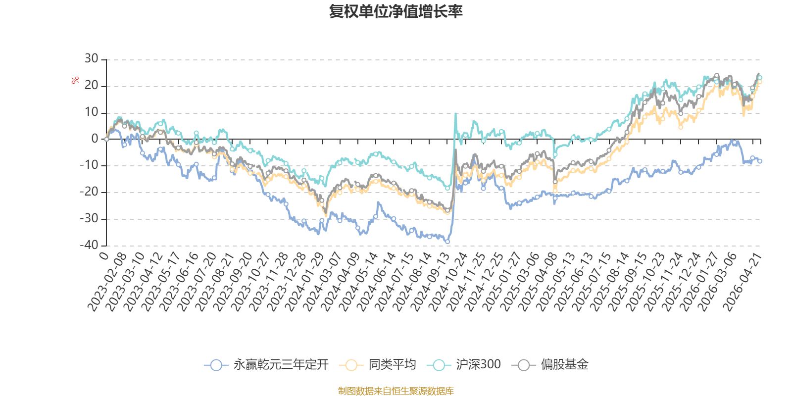 截至4月21日,永赢乾元三年定开近三个月复权单位净值增长率为-2.33%,位于同类可比基金455/689;近半年复权单位净值增长率为4.56%,位于同类可比基金436/689;近一年复权单位净值增长率为16.50%,位于同类可比基金562/685;近三年复权单位净值增长率为-1.64%,位于同类可比基金340/422。