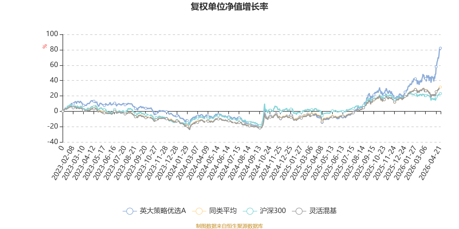 截至4月21日,英大策略优选A近三个月复权单位净值增长率为28.43%,位于同类可比基金23/1287;近半年复权单位净值增长率为46.91%,位于同类可比基金33/1286;近一年复权单位净值增长率为102.27%,位于同类可比基金79/1286;近三年复权单位净值增长率为66.04%,位于同类可比基金133/1286。