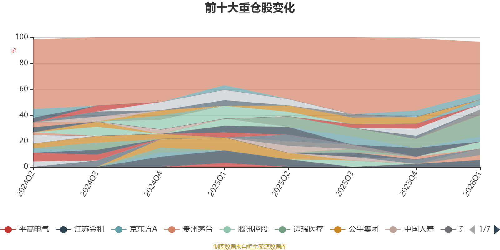 截至2026年一季度末,基金十大重仓股分别是伊利股份、宁波银行、江苏金租、东航物流、中国移动、新宙邦、安井食品、兔宝宝、美的集团、贵州茅台。