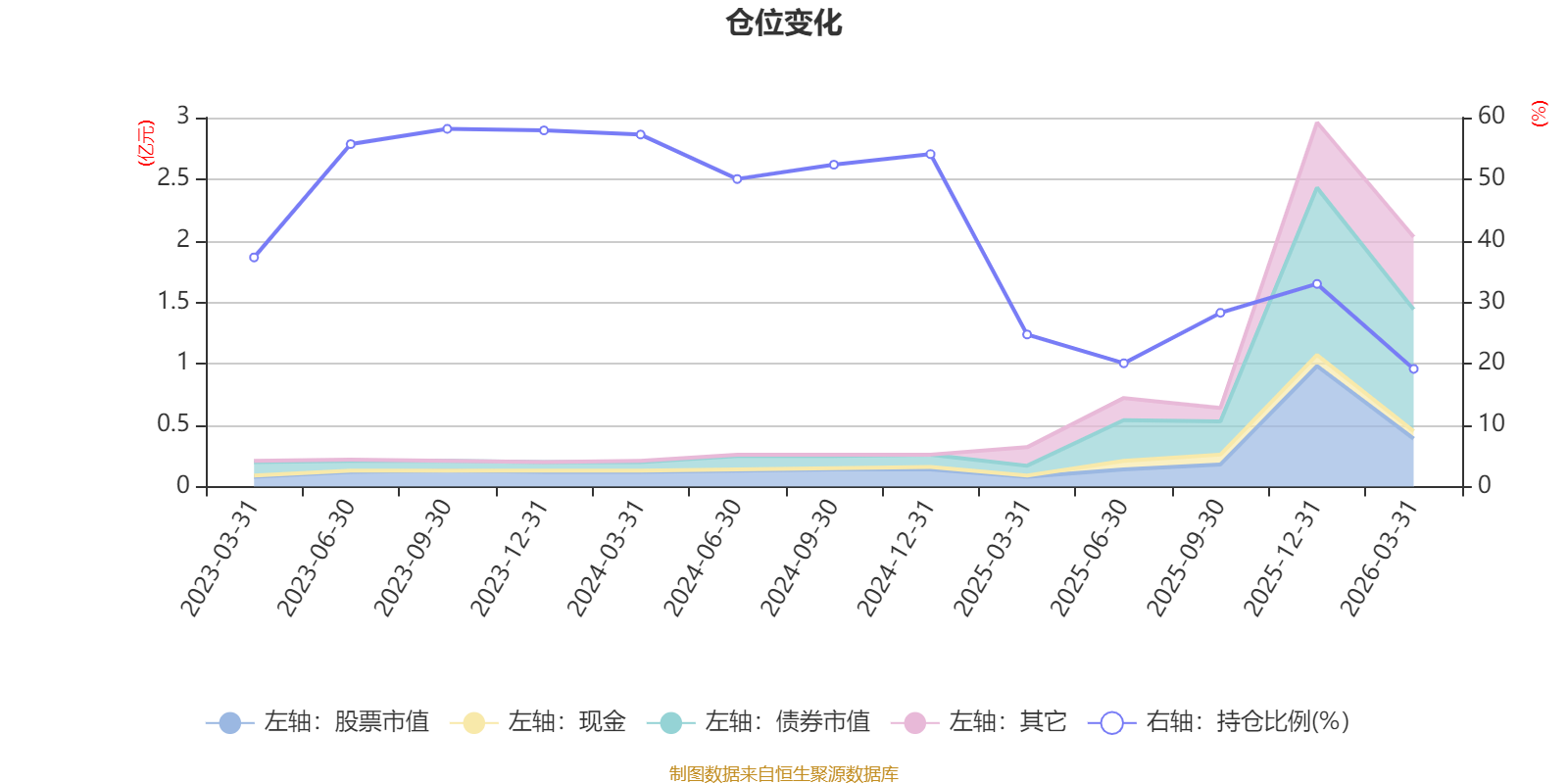 据定期报告数据统计,近三年平均股票仓位为42.55%,同类平均为67.34%。2023年三季度末基金达到58.17%的最高仓位,2026年一季度末最低,为19.14%。