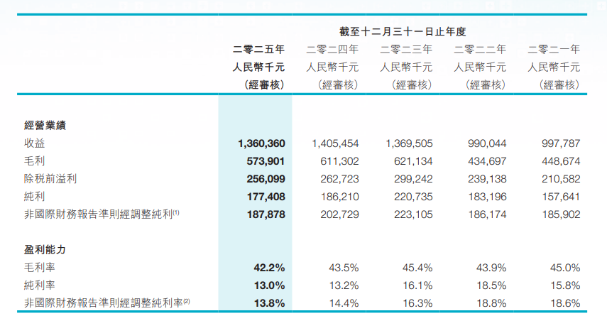 根据年报,朝聚眼科2025年实现总收益约13.60亿元(人民币,下同),较2024年的14.05亿元减少3.2%。年内溢利为1.77亿元,同比下降4.7%;其中,公司拥有人应占溢利为1.83亿元,同比下降约6.0%。