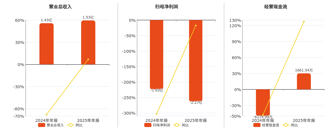 公司营业总收入为1.53亿元。归母净利润为-2.27亿元,较去年同报告期归母净利润减少3412.03万元。经营活动现金净流入为1661.54万元。