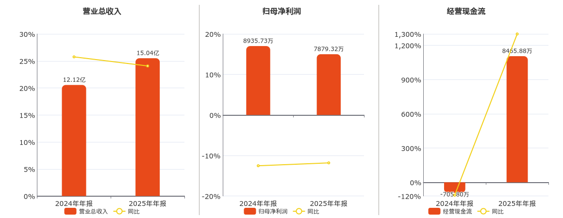 公司营业总收入为15.04亿元,在已披露的同业公司中排名第10。归母净利润为7879.32万元,在已披露的同业公司中排名第14,较去年同报告期归母净利润减少1056.41万元,同比较去年同期下降11.82%。经营活动现金净流入为8465.88万元,在已披露的同业公司中排名第12。