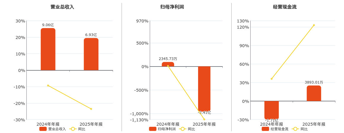 公司营业总收入为6.93亿元,较去年同报告期营业总收入减少2.13亿元,同比较去年同期下降23.52%。归母净利润为-2.41亿元,较去年同报告期归母净利润减少2.64亿元,同比较去年同期下降1125.27%。经营活动现金净流入为3893.01万元。