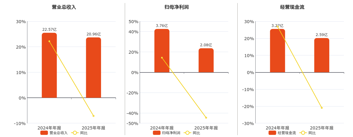 公司营业总收入为20.96亿元,在已披露的同业公司中排名第8,较去年同报告期营业总收入减少1.61亿元,同比较去年同期下降7.15%。归母净利润为2.08亿元,较去年同报告期归母净利润减少1.68亿元,同比较去年同期下降44.59%。经营活动现金净流入为2.59亿元,在已披露的同业公司中排名第7,较去年同报告期经营活动现金净流入减少6862.31万元,同比较去年同期下降20.96%。