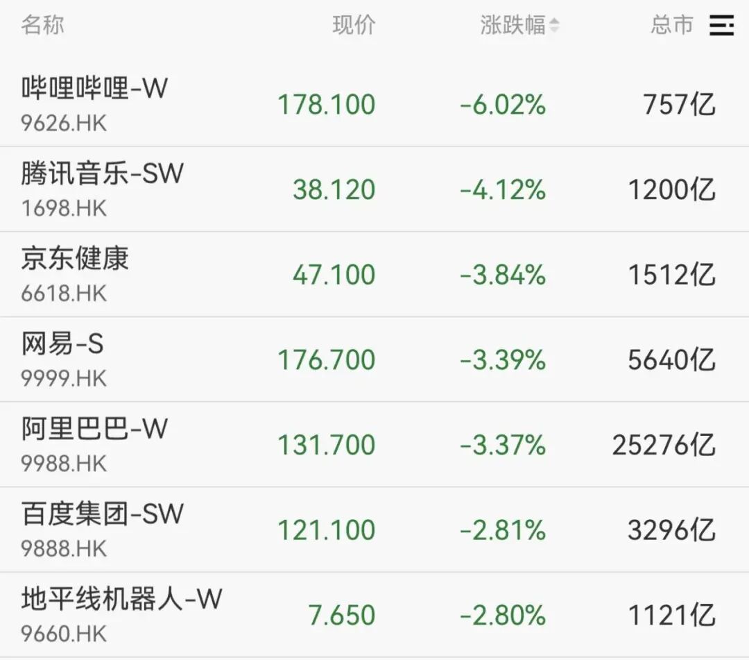 港股方面,恒生科技指数跌超2%,哔哩哔哩、腾讯音乐、京东健康等跌幅居前。