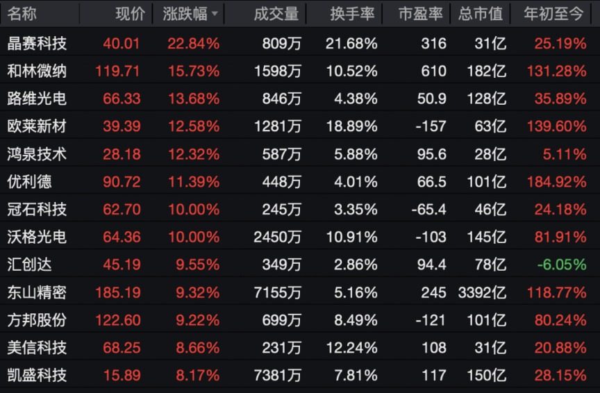 电子元器件板块表现活跃,晶赛科技涨超20%,和林微纳、路维光电、欧莱新材等涨幅居前,冠石科技直线拉涨停。