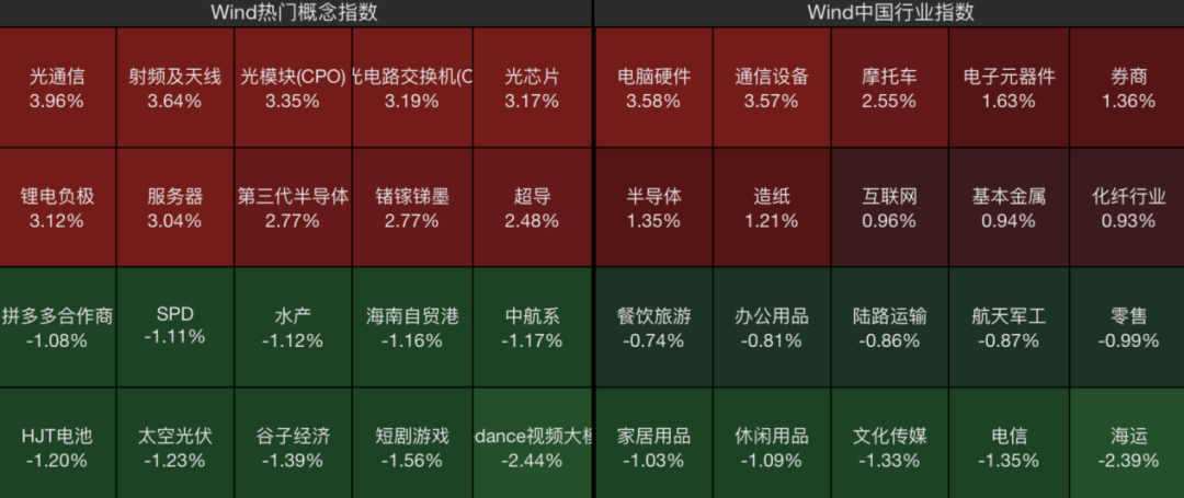 板块上来看,通信设备、CPO、电子元器件、半导体等板块表现活跃,海运、文化传媒、航天军工等板块震荡调整。