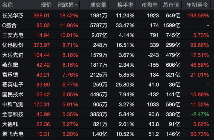 半导体概念股走强,长光华芯涨幅居前,三安光电涨停;优迅股份、天岳先进、燕东微等涨幅居前。