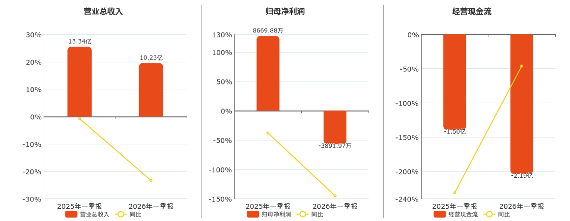 公司营业总收入为10.23亿元,较去年同报告期营业总收入减少3.11亿元,同比较去年同期下降23.32%。归母净利润为-3891.97万元,较去年同报告期归母净利润减少1.26亿元,同比较去年同期下降144.89%。经营活动现金净流入为-2.19亿元,较去年同报告期经营活动现金净流入减少6937.40万元。