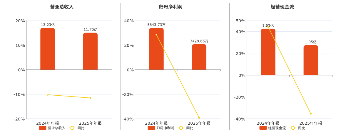 公司营业总收入为11.70亿元,较去年同报告期营业总收入减少1.53亿元,同比较去年同期下降11.54%。归母净利润为3428.65万元,较去年同报告期归母净利润减少2215.08万元,同比较去年同期下降39.25%。经营活动现金净流入为1.05亿元,较去年同报告期经营活动现金净流入减少5769.20万元,同比较去年同期下降35.45%。