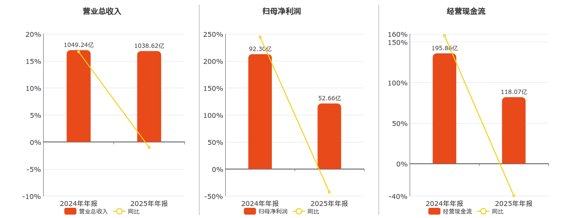 公司营业总收入为1038.62亿元,较去年同报告期营业总收入减少17.83亿元,同比较去年同期下降1.69%。归母净利润为52.66亿元,较去年同报告期归母净利润减少40.14亿元,同比较去年同期下降43.25%。经营活动现金净流入为118.07亿元,较去年同报告期经营活动现金净流入减少77.99亿元,同比较去年同期下降39.78%。