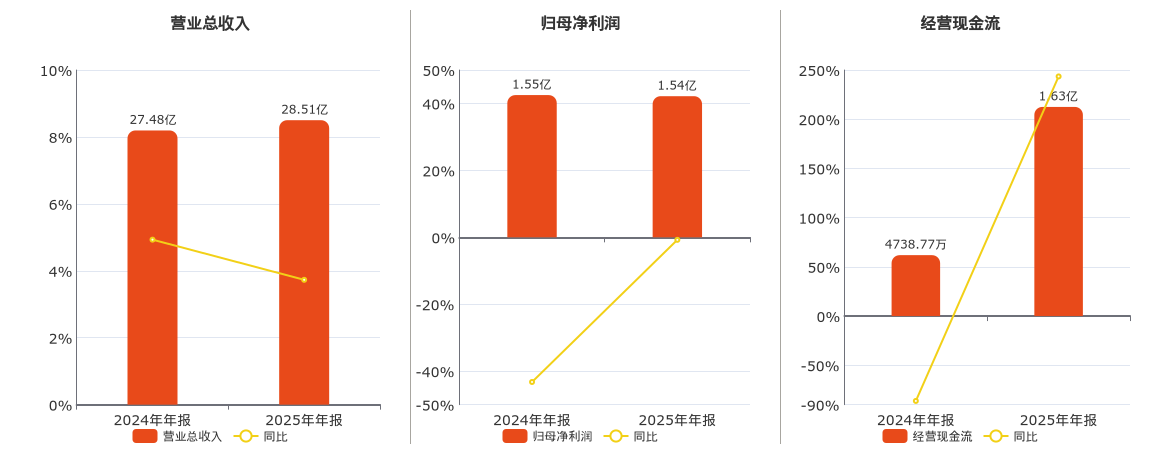 公司营业总收入为28.51亿元。归母净利润为1.54亿元,较去年同报告期归母净利润减少116.52万元,同比较去年同期下降0.75%。经营活动现金净流入为1.63亿元。