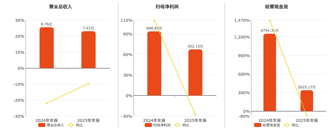 公司营业总收入为7.91亿元,较去年同报告期营业总收入减少8514.79万元,同比较去年同期下降9.72%。归母净利润为502.15万元,较去年同报告期归母净利润减少196.69万元,同比较去年同期下降28.14%。经营活动现金净流入为2625.17万元,较去年同报告期经营活动现金净流入减少7129.14万元,同比较去年同期下降73.09%。