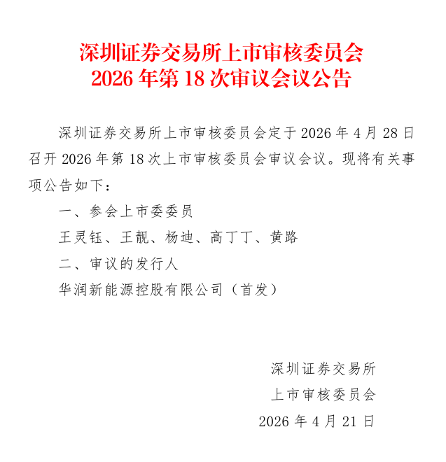 4月21日,深圳证券交易所上市审核委员会公告称,定于2026年4月28日召开2026年第18次上市审核委员会审议会议,审议华润新能源控股有限公司(简称华润新能源)首发事项。