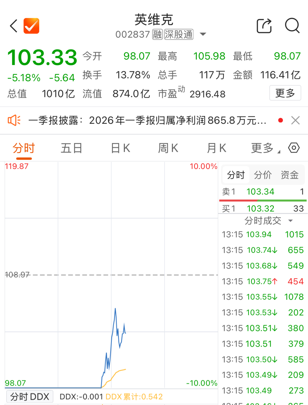 此外,液冷人气股英维克(002837)在早间打开跌停板后,午后股价一度冲高,截至发稿其跌幅收窄至5.18%,市值突破千亿元。此前,英维克早间开盘跌停,市值跌破1000亿元。详见超30万手封单!液冷人气股继续“一字”跌停