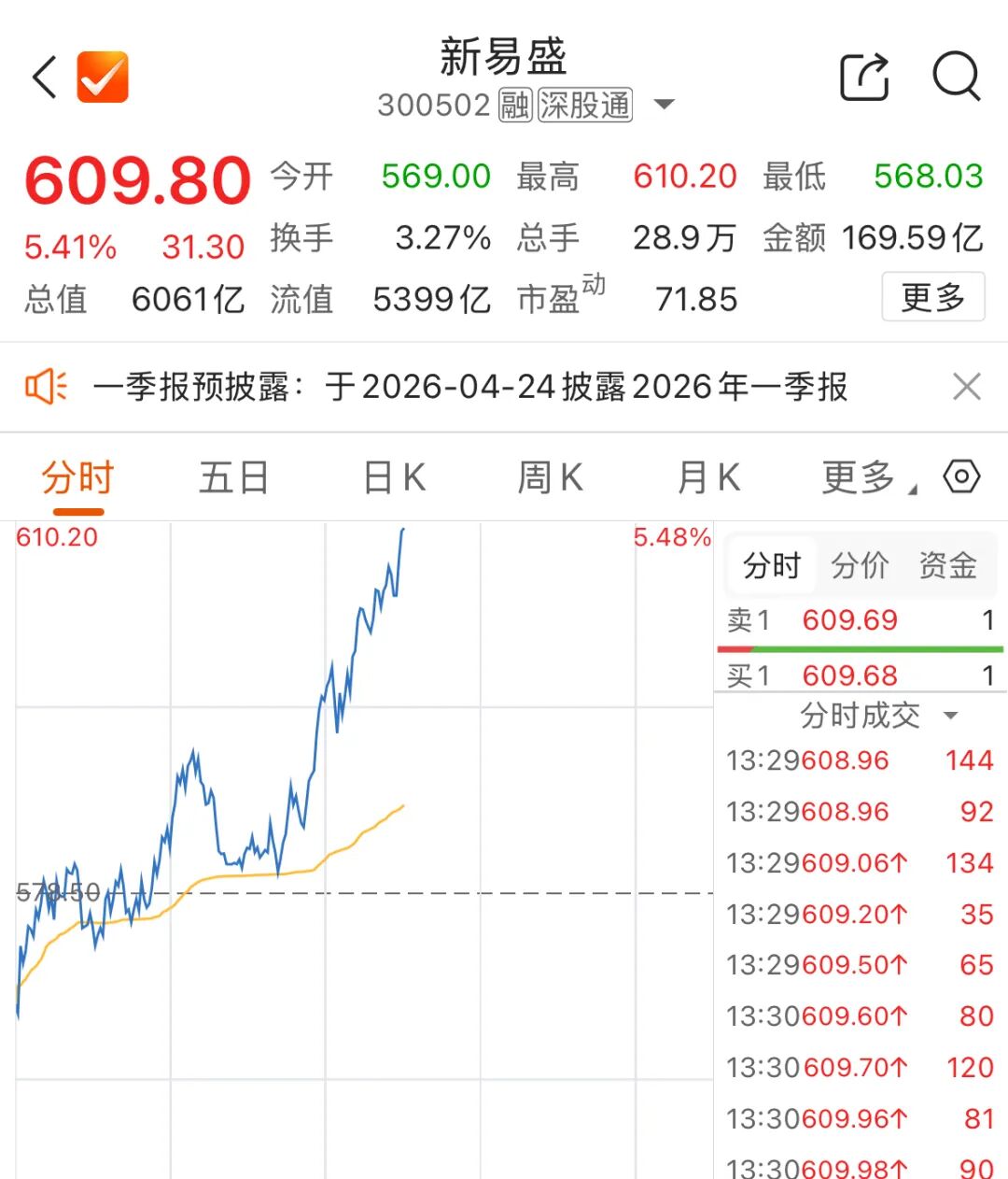 午后,光模块龙头新易盛(300502)涨逾5%,股价续创历史新高,总市值突破6000亿元。