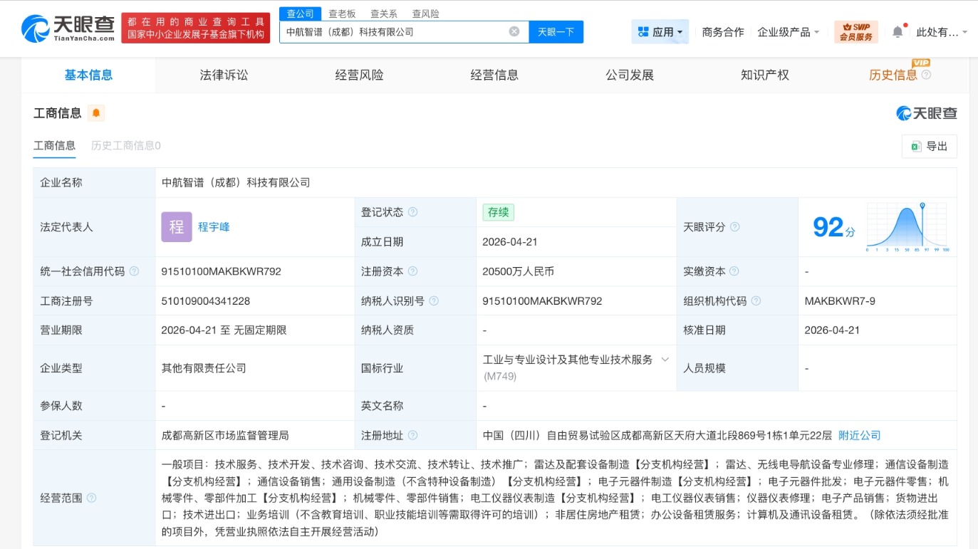 南方财经4月22日电,天眼查App显示,近日,中航智谱(成都)科技有限公司成立,法定代表人为程宇峰,注册资本2.05亿人民币,经营范围含雷达及配套设备制造、通信设备制造、通信设备销售、电子元器件制造、电子元器件批发、电子元器件零售、非居住房地产租赁等。股东信息显示,该公司由中国航空工业集团有限公司、中国航空工业集团公司雷华电子技术研究所共同持股。