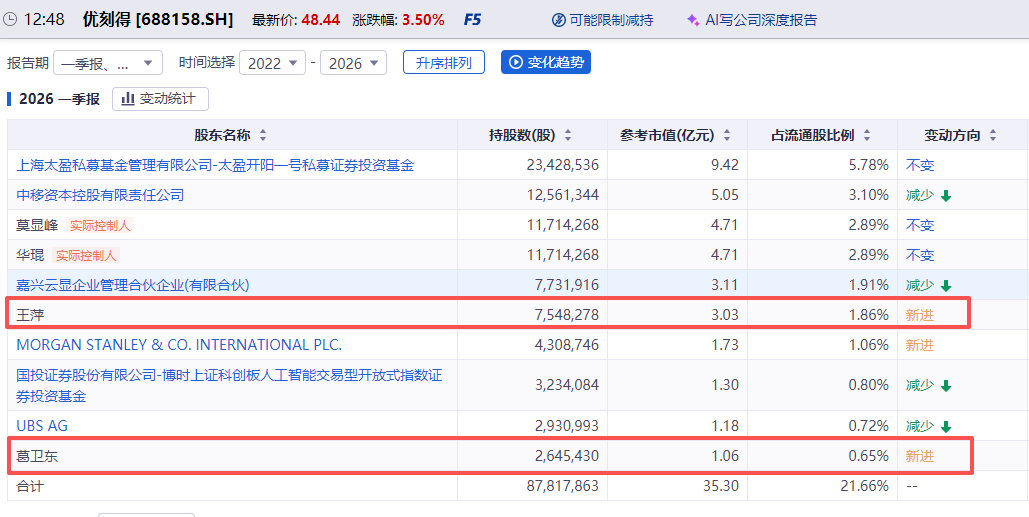 4月20日,优刻得正式披露2026年第一季度报告。报告显示,截至一季度末,葛卫东和其关联人王萍双双新进入该公司前十大流通股东名单。其中,葛卫东持有264.5万股,王萍持有754.8万股,二人合计持有超1000万股。