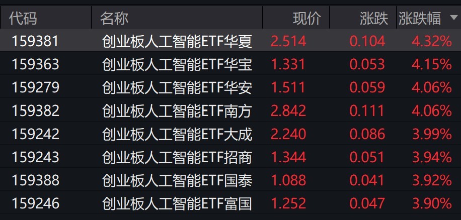 受盘面影响,创业板人工智能相关ETF涨约4%。