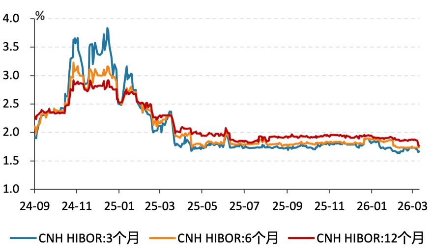 此外,从香港离岸人民币拆借利率的走势也能看出,目前各期限利率基本保持在2%以下(见下图),且稳中有降。这种低成本、高效率的融资环境,确实为提升人民币国际融资功能提供了一个难得的有利时机。
