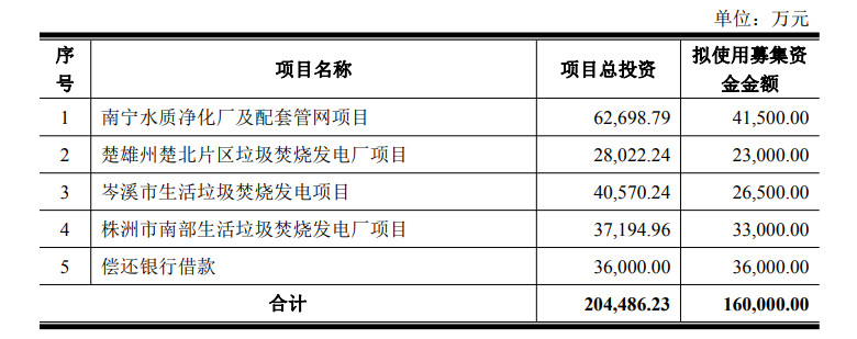 本次发行募集资金总额不超过16亿元,扣除发行费用后,将投向五个方向:南宁水质净化厂及配套管网项目(拟投入4.15亿元)、楚雄州楚北片区垃圾焚烧发电厂项目(拟投入2.30亿元)、岑溪市生活垃圾焚烧发电项目(拟投入2.65亿元)、株洲市南部生活垃圾焚烧发电厂项目(拟投入3.30亿元),以及偿还银行借款(3.60亿元)。