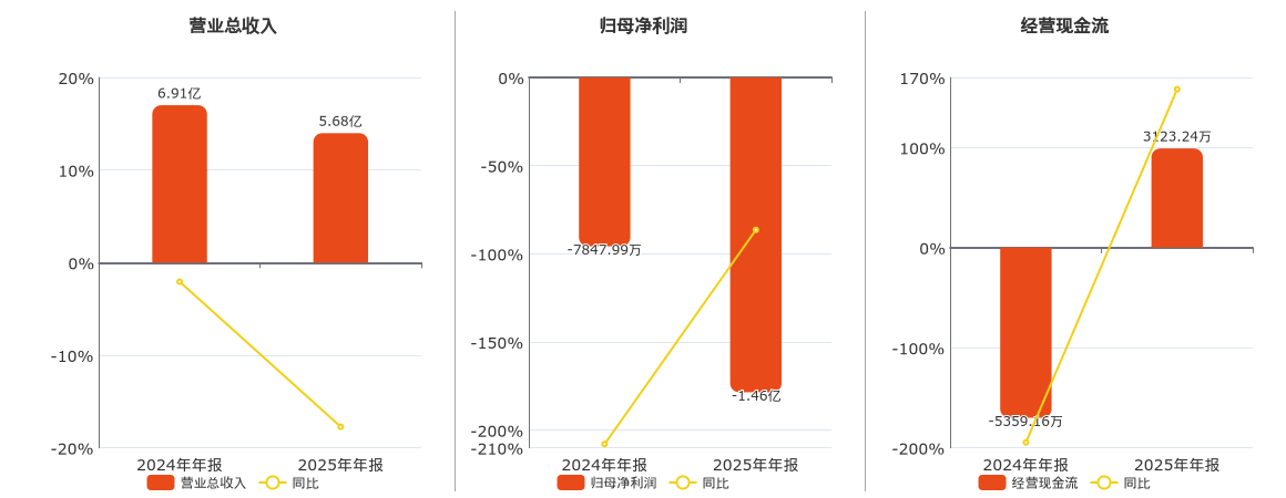 公司营业总收入为5.68亿元,较去年同报告期营业总收入减少1.22亿元,同比较去年同期下降17.73%。归母净利润为-1.46亿元,较去年同报告期归母净利润减少6783.52万元。经营活动现金净流入为3123.24万元。