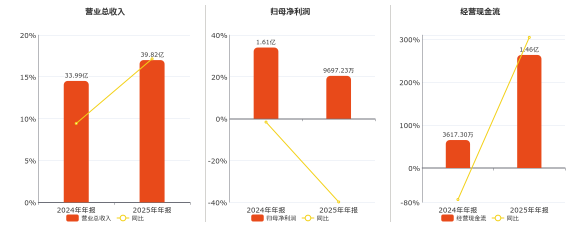公司营业总收入为39.82亿元。归母净利润为9697.23万元,较去年同报告期归母净利润减少6414.01万元,同比较去年同期下降39.81%。经营活动现金净流入为1.46亿元。