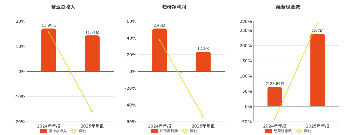 公司营业总收入为11.71亿元,较去年同报告期营业总收入减少2.25亿元,同比较去年同期下降16.11%。归母净利润为1.11亿元,较去年同报告期归母净利润减少1.32亿元,同比较去年同期下降54.26%。经营活动现金净流入为2.67亿元。