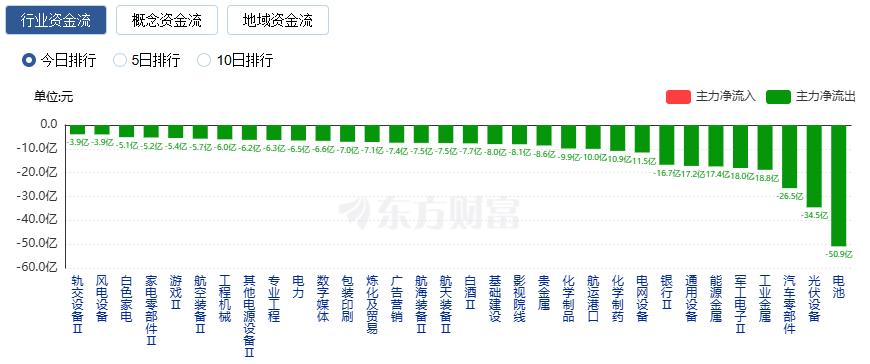 净流出方面,电池、光伏设备、汽车零部件等净流出排名靠前,其中电池净流出50.91亿元。