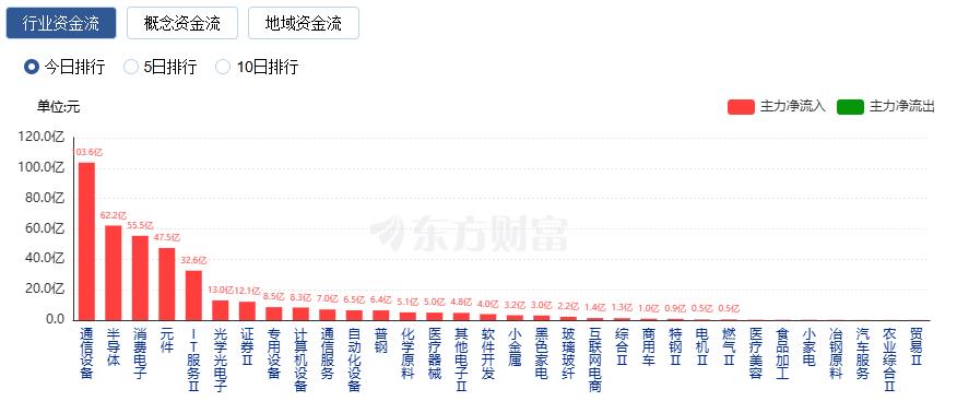 行业资金方面,截至收盘,通信设备、半导体、消费电子等净流入排名靠前,其中通信设备净流入103.6亿。