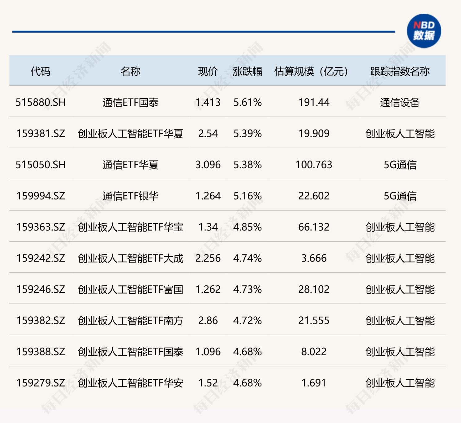 ETF涨跌幅方面,通信、人工智能相关ETF涨超5%。