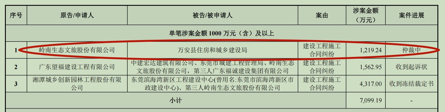 耐人寻味的是,仅仅两个月之后,ST岭南又以同样的案由对万安县住建局发起仲裁,涉案金额1219.24万元。