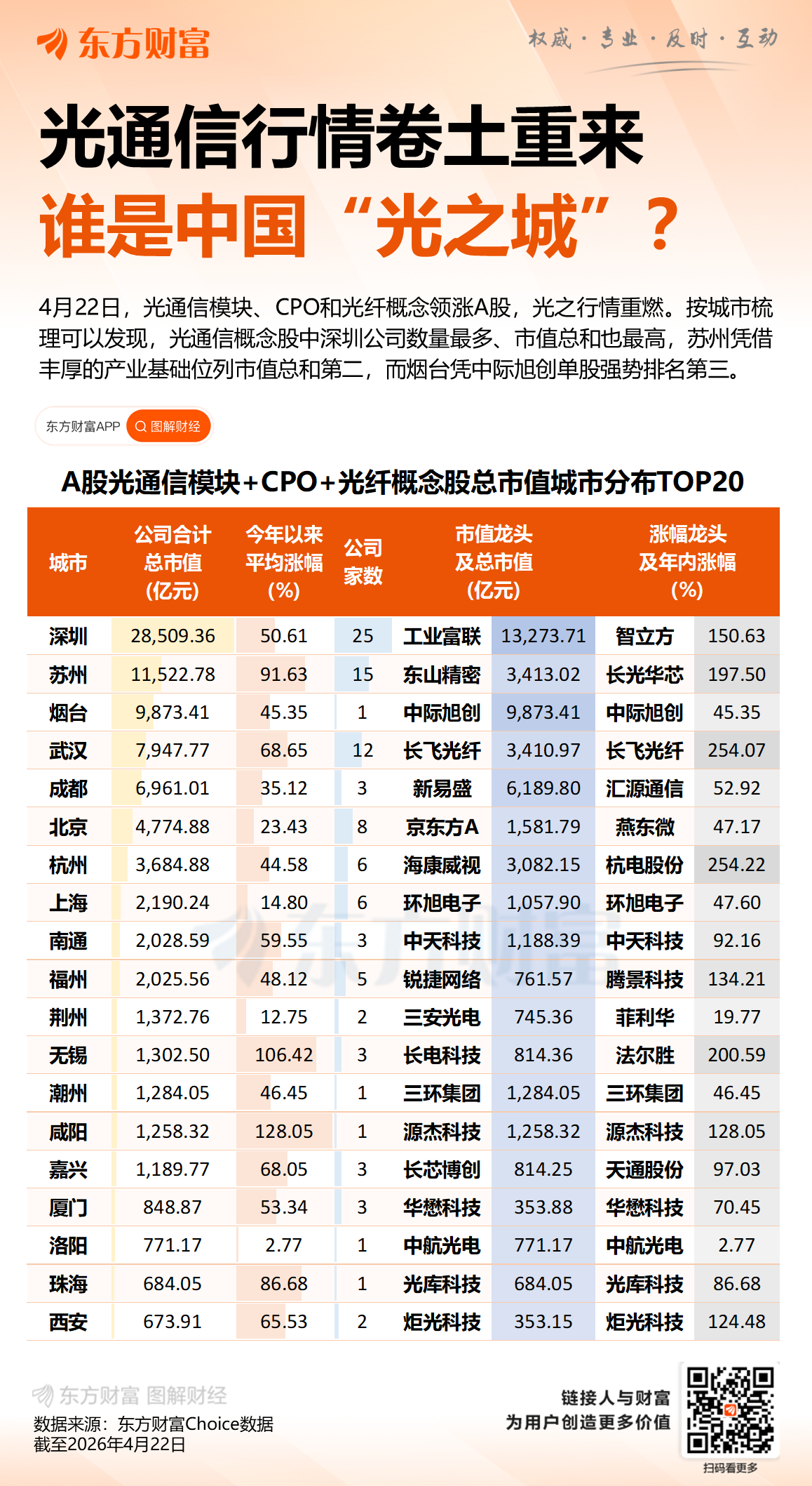 4月22日盘中,A股CPO概念股集体拉升,长光华芯、新易盛、沃格光电、长盈通、东山精密、仕佳光子、光库科技、长飞光纤、特发信息等纷纷创出历史新高。
