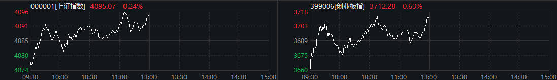 中新经纬4月22日电 22日,A股三大股指低开后集体翻红。截至午盘,上证指数涨0.24%报4095.07点,深证成指涨0.63%报15076.15点,创业板指涨0.63%报3712.28点。