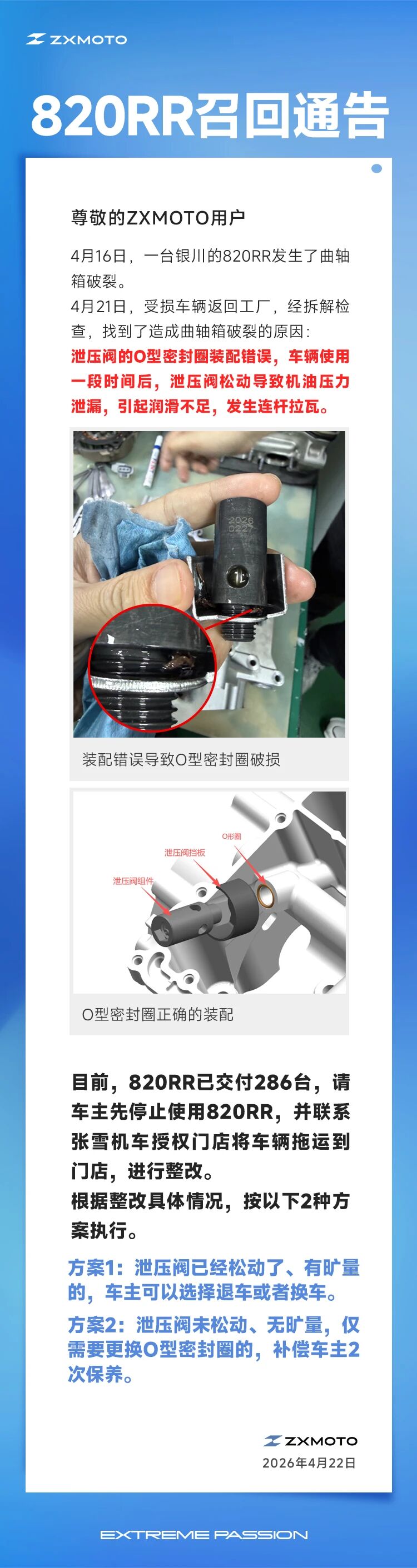 【大河财立方消息】4月22日,张雪机车发布820RR召回通告。通告称,4月16日,一台银川的820RR发生了曲轴箱破裂。4月21日,受损车辆返回工厂,经拆解检查,找到了造成曲轴箱破裂的原因:泄压阀的O型密封圈装配错误,车辆使用一段时间后,泄压阀松动导致机油压力泄漏,引起润滑不足,发生连杆拉瓦。
