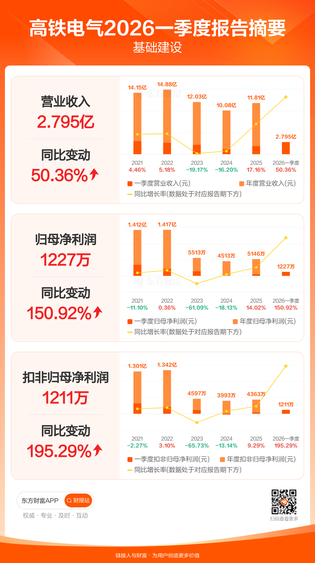 高铁电气4月23日发布2026年一季报显示,公司一季度实现营业收入2.79亿元,同比增长50.36%;归母净利润1227.21万元,同比增长150.92%;扣非归母净利润1211.39万元,同比增长195.29%。