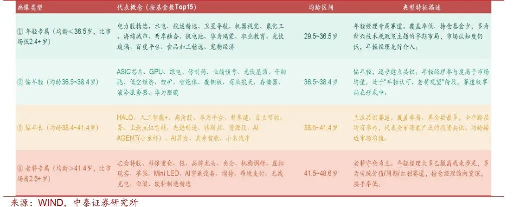 在核心共识行业,代表如通信(39.2岁)、电子(39.6岁)、电力设备(39.7岁)、有色金属(40.8岁)等;