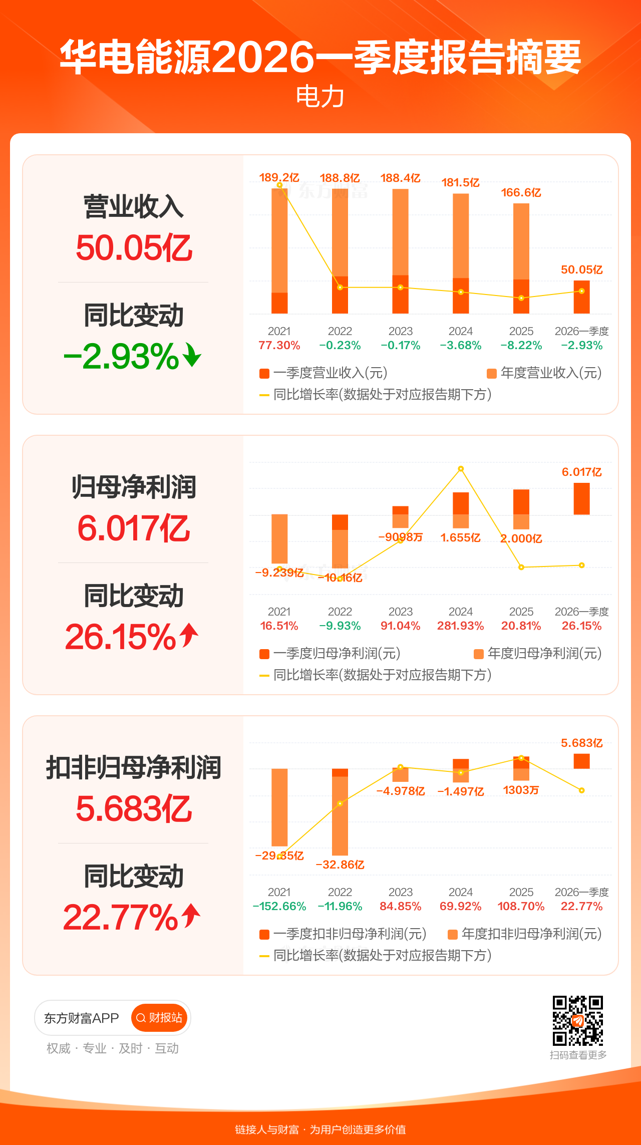 华电能源4月23日发布2026年一季报显示,公司一季度实现营业收入50.05亿元,同比下滑2.93%;归母净利润6.02亿元,同比增长26.15%;扣非归母净利润5.68亿元,同比增长22.77%。