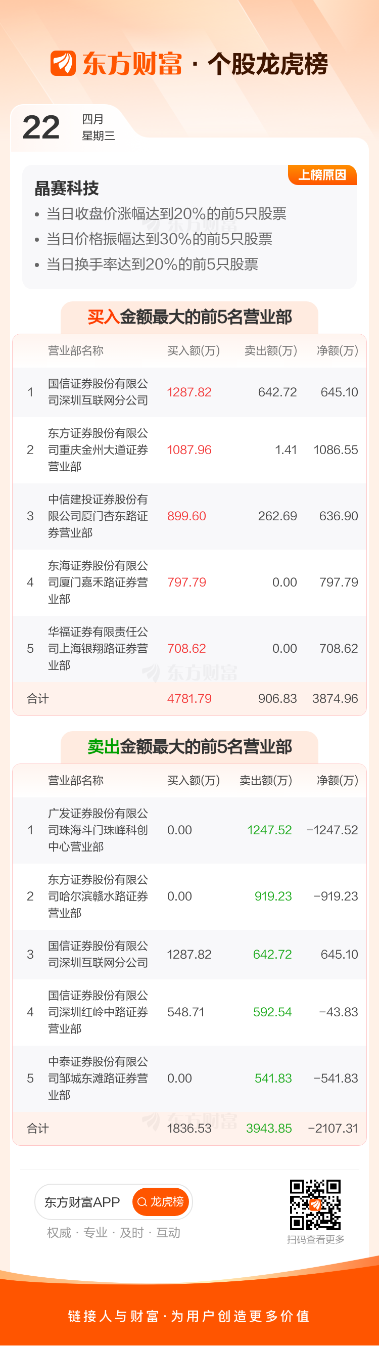 交易所2026年4月22日公布的交易公开信息显示,晶赛科技因成为当日收盘价涨幅达到20%的前5只股票、当日价格振幅达到30%的前5只股票、当日换手率达到20%的前5只股票上榜。晶赛科技当日收报42.34元,涨跌幅30.00%,偏离值30.00%,换手率31.17%,成交额4.51亿。