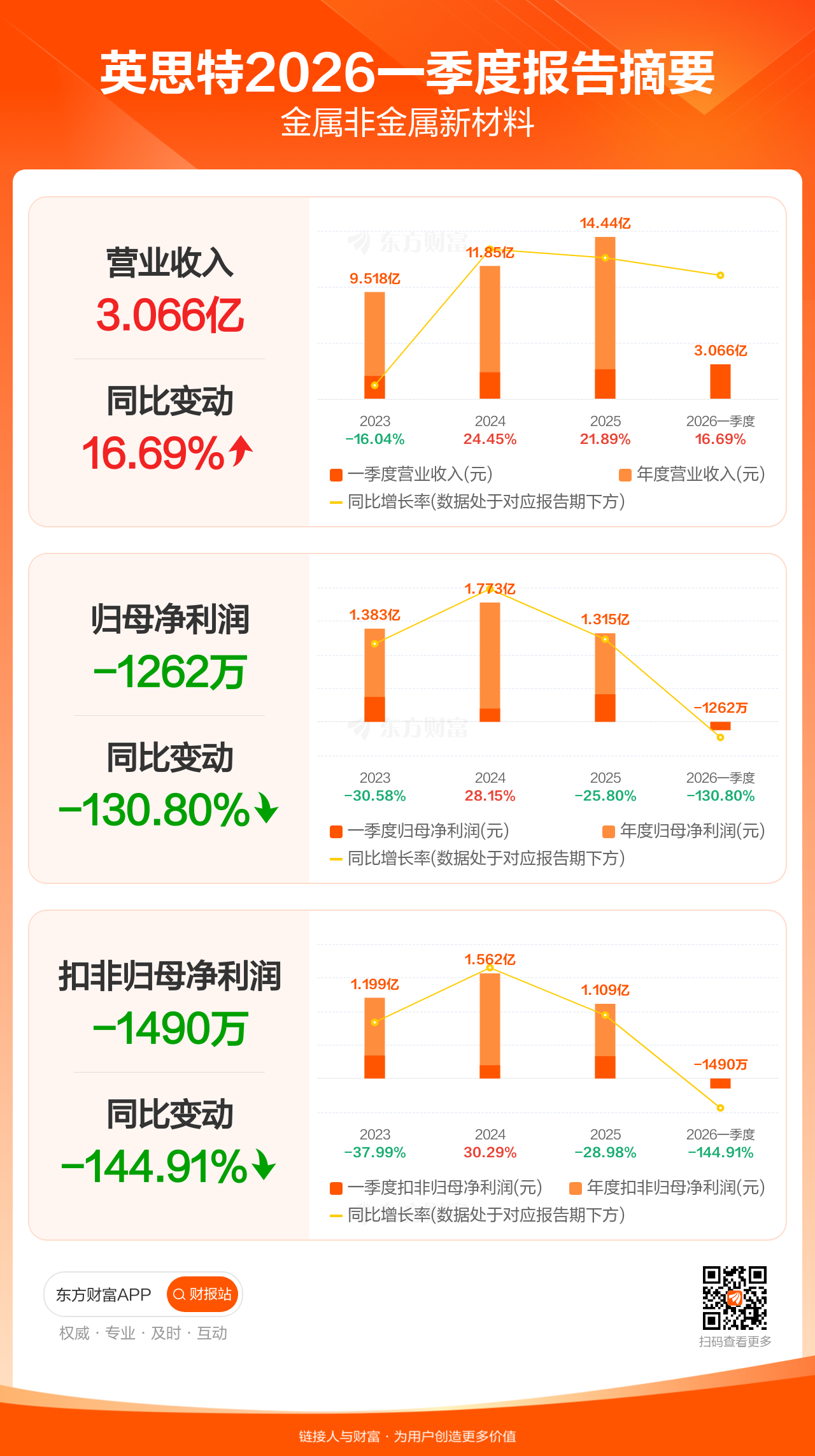 英思特4月23日发布2026年一季报显示,公司一季度实现营业收入3.07亿元,同比增长16.69%;归母净利润-1262.44万元;扣非归母净利润-1489.89万元。