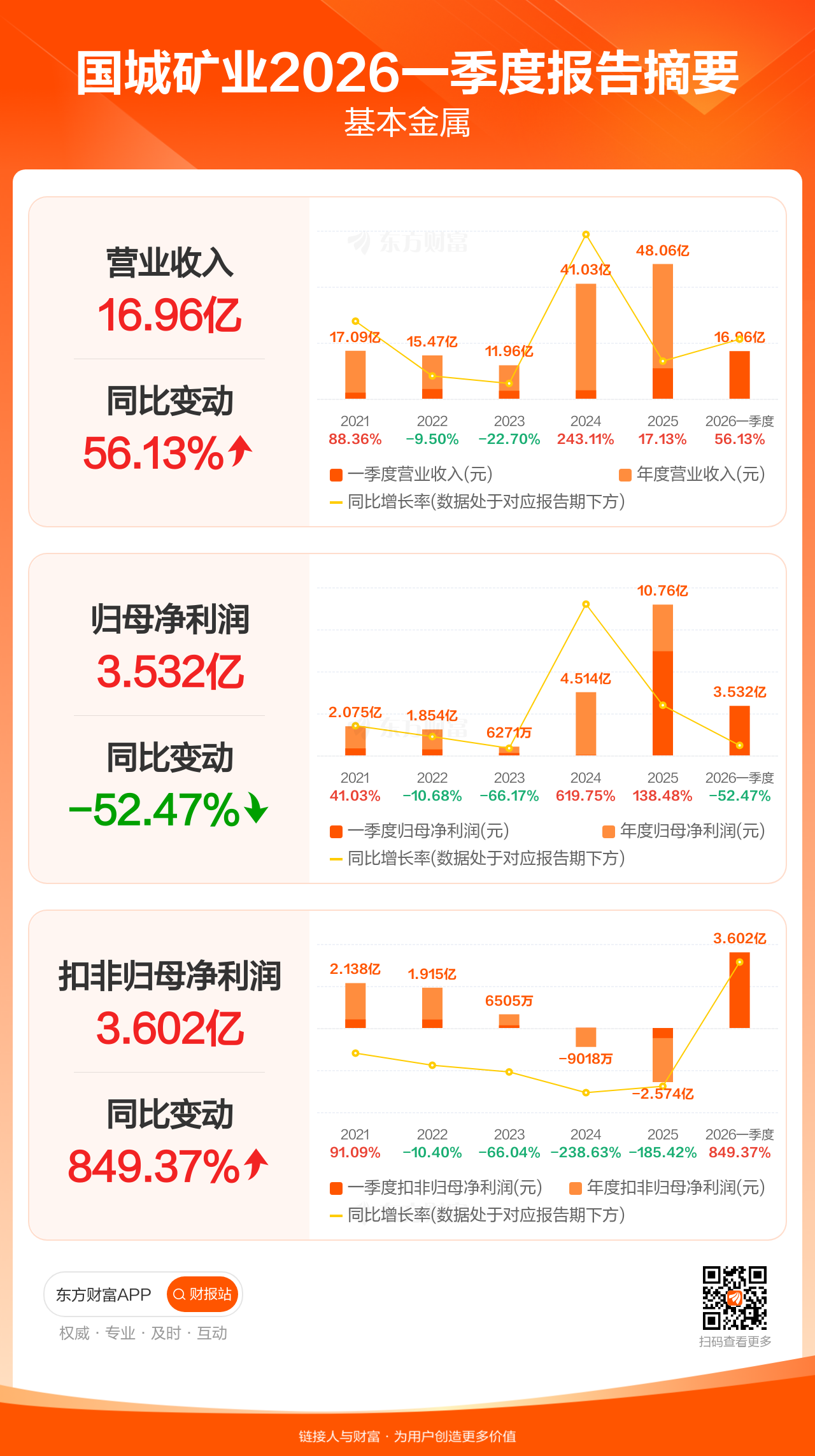 国城矿业4月23日发布2026年一季报显示,公司一季度实现营业收入16.96亿元,同比增长56.13%;归母净利润3.53亿元,同比下滑52.47%;扣非归母净利润3.60亿元,同比增长849.37%。