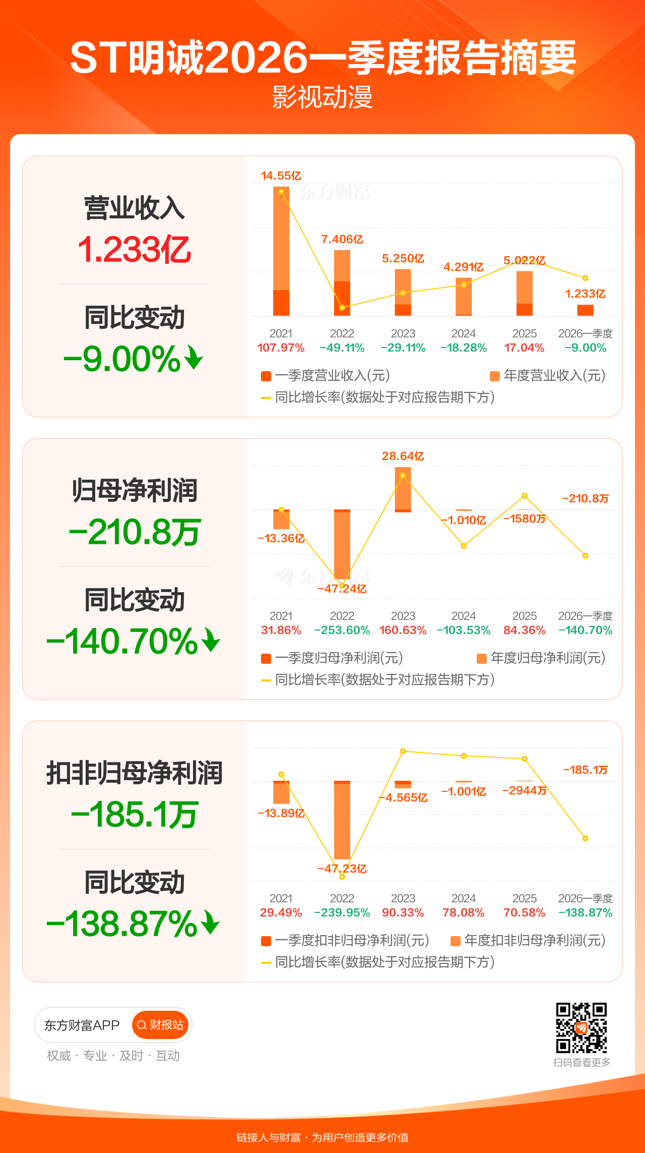 ST明诚4月23日发布2026年一季报显示,公司一季度实现营业收入1.23亿元,同比下滑9.00%;归母净利润-210.80万元;扣非归母净利润-185.06万元。