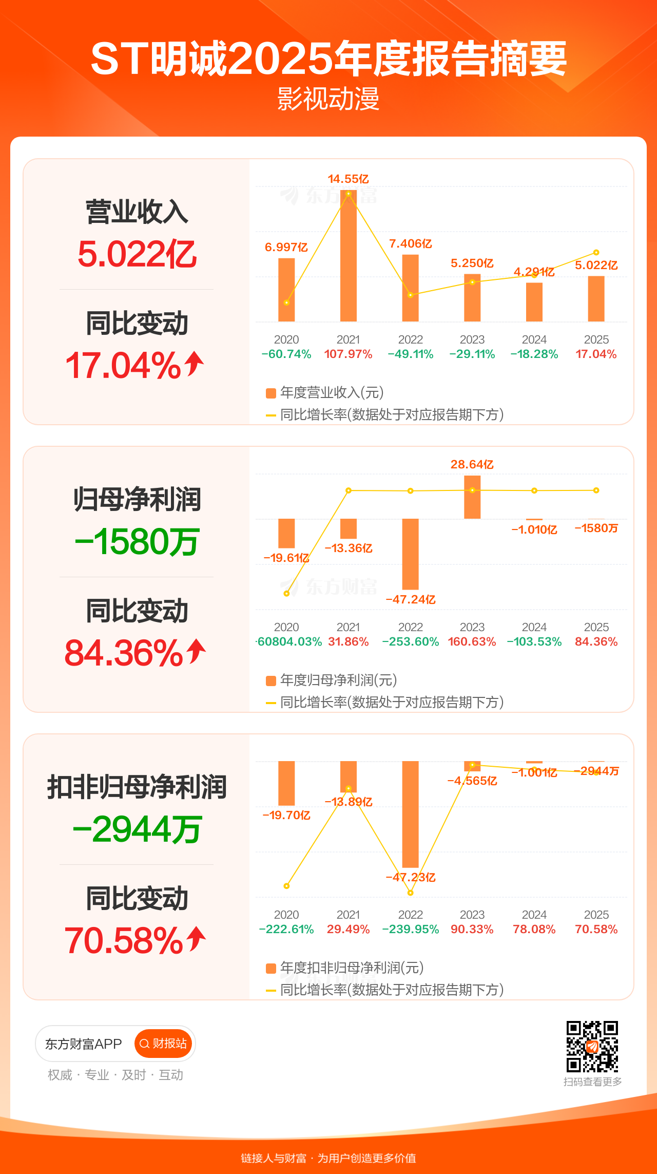 ST明诚4月23日发布2025年年报显示,公司全年实现营业收入5.02亿元,同比增长17.04%;归母净利润-1579.89万元;扣非归母净利润-2944.30万元。