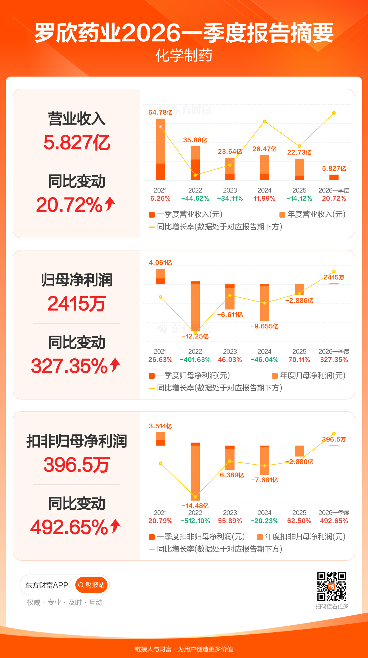 罗欣药业4月23日发布2026年一季报显示,公司一季度实现营业收入5.83亿元,同比增长20.72%;归母净利润2415.01万元,同比增长327.35%;扣非归母净利润396.46万元,同比增长492.65%。