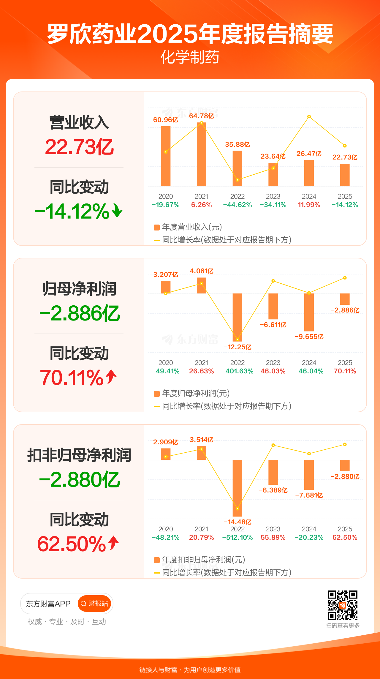 罗欣药业4月23日发布2025年年报显示,公司全年实现营业收入22.73亿元,同比下滑14.12%;归母净利润-2.89亿元;扣非归母净利润-2.88亿元。