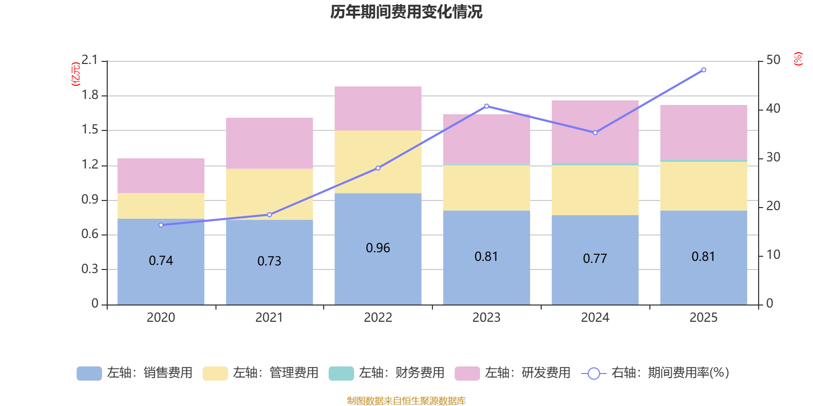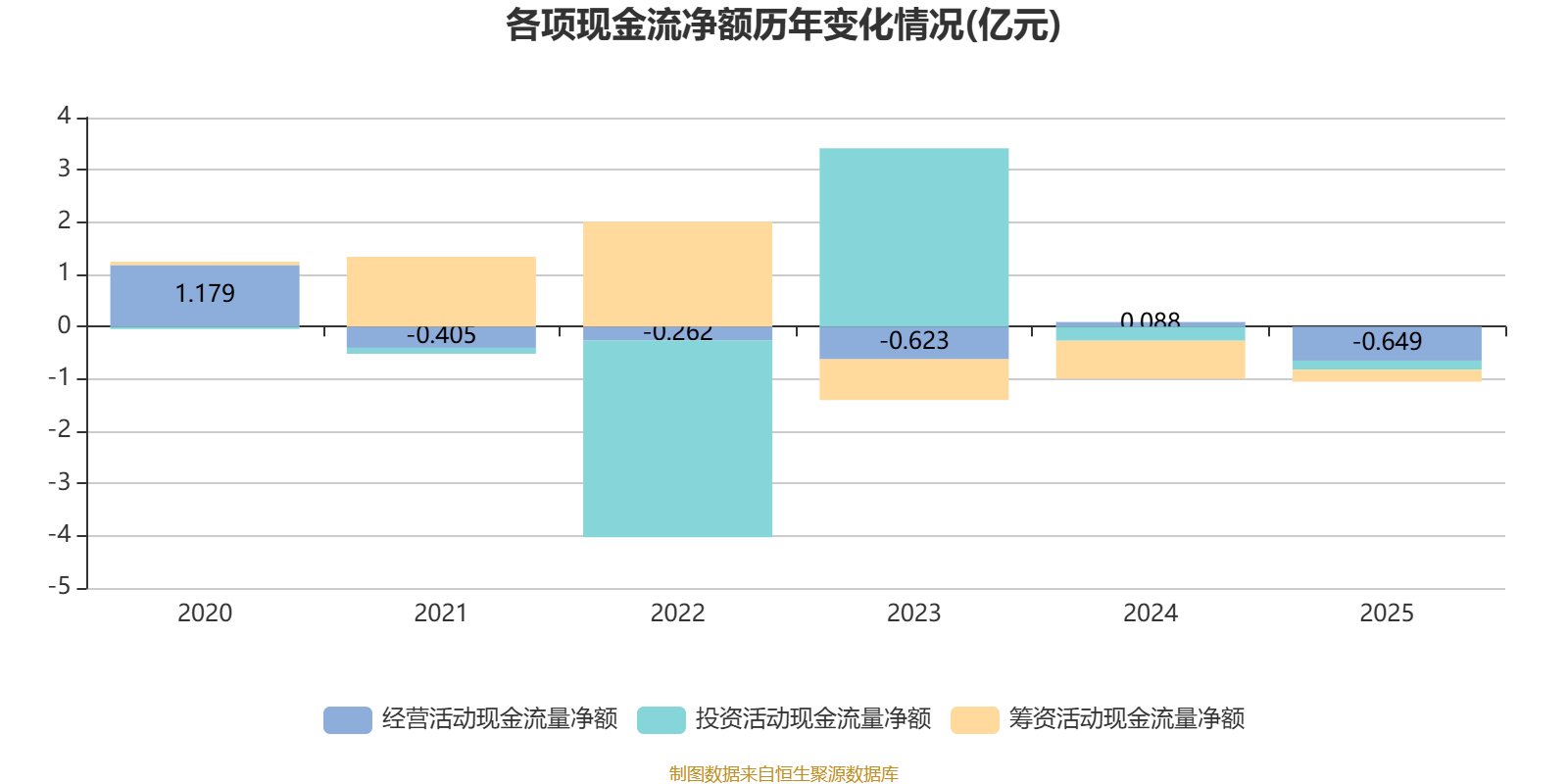 2025年,公司经营活动现金流净额为-6492.4万元,同比减少7374.8万元;筹资活动现金流净额-2291.1万元,同比增加4958.7万元;投资活动现金流净额-1749.7万元,上年同期为-2688.3万元。