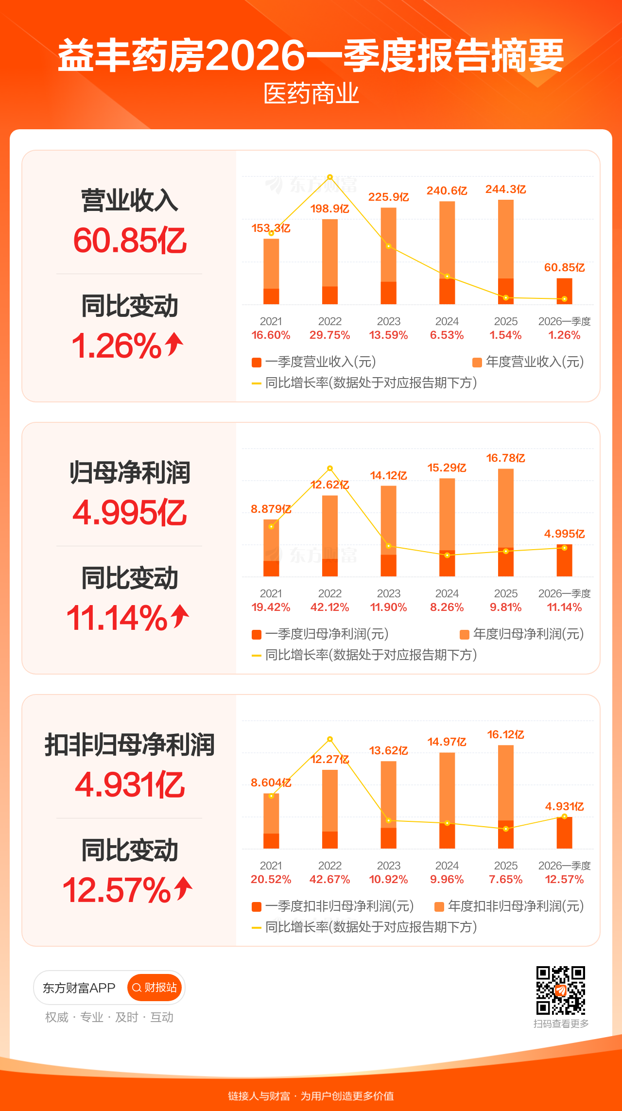 益丰药房4月23日发布2026年一季报显示,公司一季度实现营业收入60.85亿元,同比增长1.26%;归母净利润5.00亿元,同比增长11.14%;扣非归母净利润4.93亿元,同比增长12.57%。