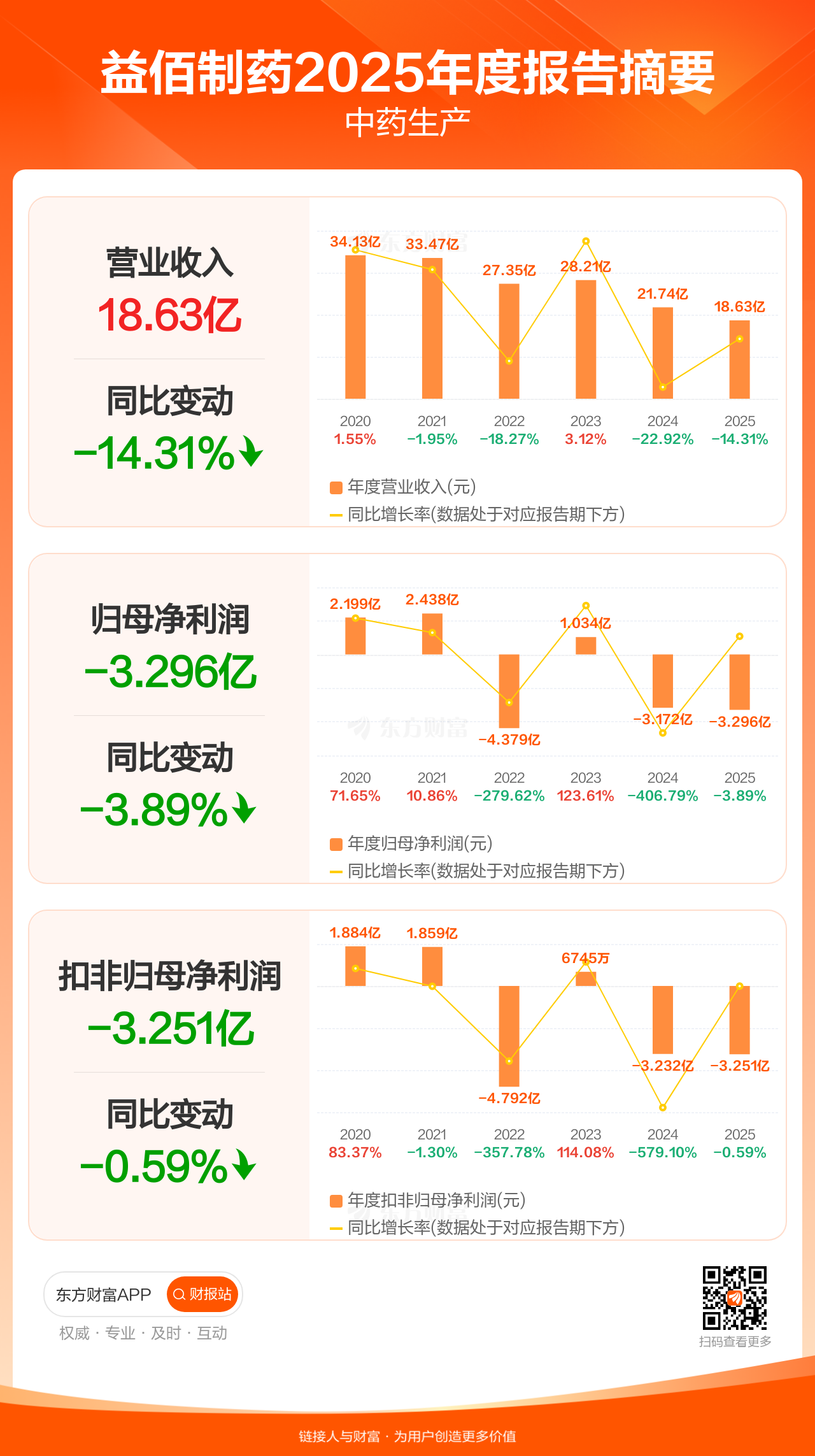 益佰制药4月23日发布2025年年报显示,公司全年实现营业收入18.63亿元,同比下滑14.31%;归母净利润-3.30亿元;扣非归母净利润-3.25亿元。